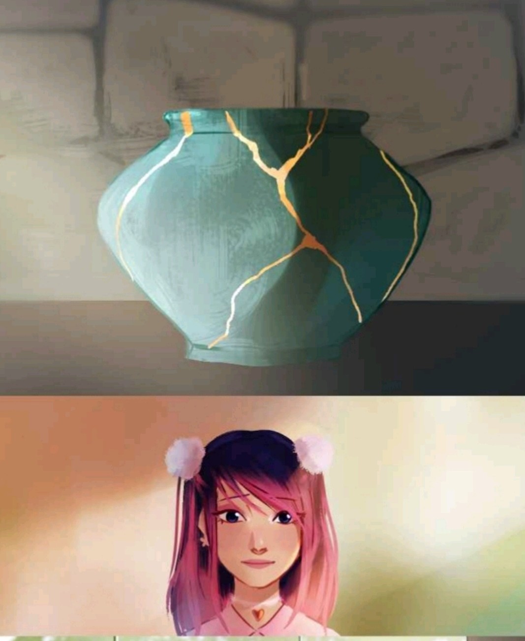 این کوزه یا گلدون به هنر ژاپنی به اسم کینتسوگی اشاره میکنه. تو این هنر، ظرفی که شکسته باشه رو بعد از ترمیم، با طلا خوشگل ش میکنند و به این جمله میرسند که شکستگی ها هویت تو هستند یا در هر نقصی زیبایی هست. همون حرفی که میوسا تو وبتون میگه. چون میوسا نماد دخترهای اسیایی تو انمشین هست مخصوصا اسیای شرقی.